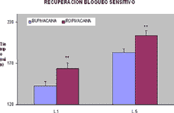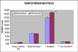 No hubo diferencias significativas con respecto a los tiempos anestesia-comienzo de cirugía llamado latencia, quirúrgico y desde el comienzo de cirugía hasta el parto pero sí en el período de analgesia (Tabla V y gráfico 2).