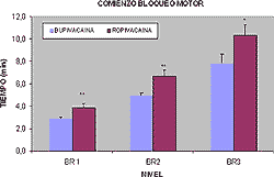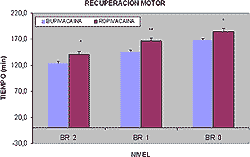 En cuanto a la relajación muscular (bloqueo motor intraoperatorio) fue para ambos grupos de satisfactoria a excelente sin registrarse casos insatisfactorios según la evaluación de los cirujanos (Tabla XIII). En cuanto a analgesia intraoperatoria (evaluada por paciente) no se necesitó en ninguno de los dos grupos del uso de drogas hipnóticas ni de conversión a anestesia general pero si del uso de fentanilo suplementario en un escaso porcentaje de pacientes durante el acto quirúrgico sin diferencias significativas. Esto hace referencia a la buena calidad del bloqueo anestésico, por lo que no hubo casos excluidos por bloqueo fallido, con 100% de anestesia exitosa y con un nivel de bloqueo suficiente en ambos grupos(Tabla XIII). La altura máxima de bloqueo alcanzado fue similar en ambos grupos; no así en cuanto a los tiempos de comienzo de los Bromage 1, 2 y 3 y del bloqueo sensitivo a nivel de T7 (latencia) que fue más rápido con bupivacaína pero similar a nivel de T4 y del nivel máximo del bloqueo (Tabla XIII). Los tiempos de recuperación de los bloqueos sensitivos y motor fueron más rápidos con bupivacaína siendo la duración de los bloqueos sensitivo y motor mayores con ropivacaína, coincidiendo con un tiempo más prolongado para el primer requerimiento analgésico en este grupo(Tabla V y XIII). En cuanto al feto la diferencia no fue significativa entre ambos grupos para los latidos cardíacos fetales (LCF) tanto previo como posterior al bloqueo ni tampoco en la comparación intragrupal(Tabla XI y XII). En el neonato, los puntajes Apgar al minuto y a los cinco minutos, edad y peso fueron similares para ambos grupos sin diferencia estadísticamente significativa; como así también en cuanto adecuado o no a edad gestacional, sexo y llanto. (Tabla XI).