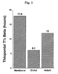 Another difference between infants and older children is maturity of hepatic function. Certainly, newborns are capable of conjugating and glucuronidating most medications but the rate of metabolism is generally delayed compared to the older child or adult. The half-life of thiopental is approximately 18 hours in a term newborn, about 7 hours in a child 4 to 10 years of age and 10 hours in the adult. Thus in addition to having less fat for the thiopental to redistribute into there is a markedly prolonged beta elimination phase due to immaturity of hepatic metabolism. Another factor is alterations in hepatic blood flow and therefore alterations in drug delivery to the liver where it can be metabolized. Any procedure that results in increased intra abdominal pressure such as an omphalocele or gastroschisis repair will decrease hepatic blood flow and also markedly delay drug metabolism. In some neonates with these surgical problems, a single dose of fentanyl has been demonstrated to maintain constant plasma values for as long as 16 hours.
